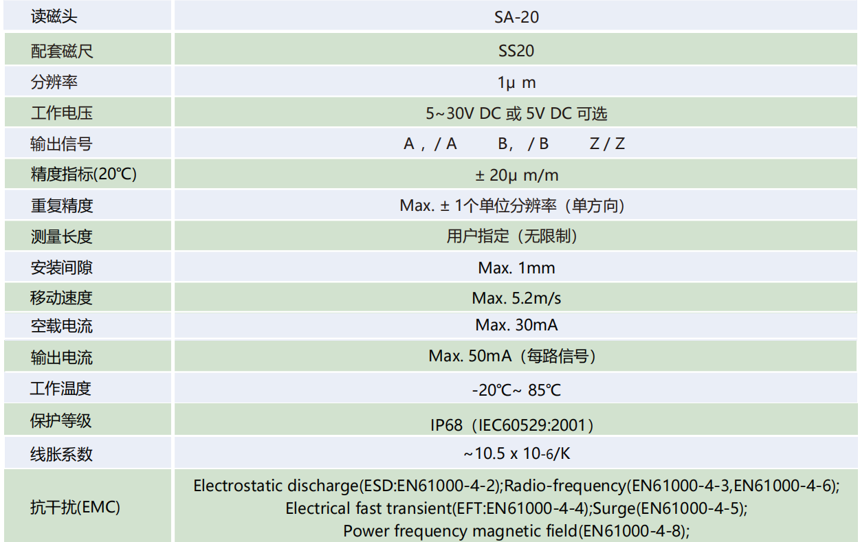 本产品是磁栅测量系统,其中 SA 是读 磁头、SS 是磁尺,它们之间根据磁感应的 原理进行工作。当 SA 读磁头在 SS 磁尺的 磁场空间中做直线运动时,读磁头会根据运 动的相关位移量实时的输出符合标准的位置 脉冲。 本产品主要用于木工、石材加工、 锯切、金属切削、纺织、印刷、包装、塑料 加工、自动化系统、切割设备、电子组装设备、测量/检测设备等。产品特点非接触、高速测量。高分辨率。内置 LED